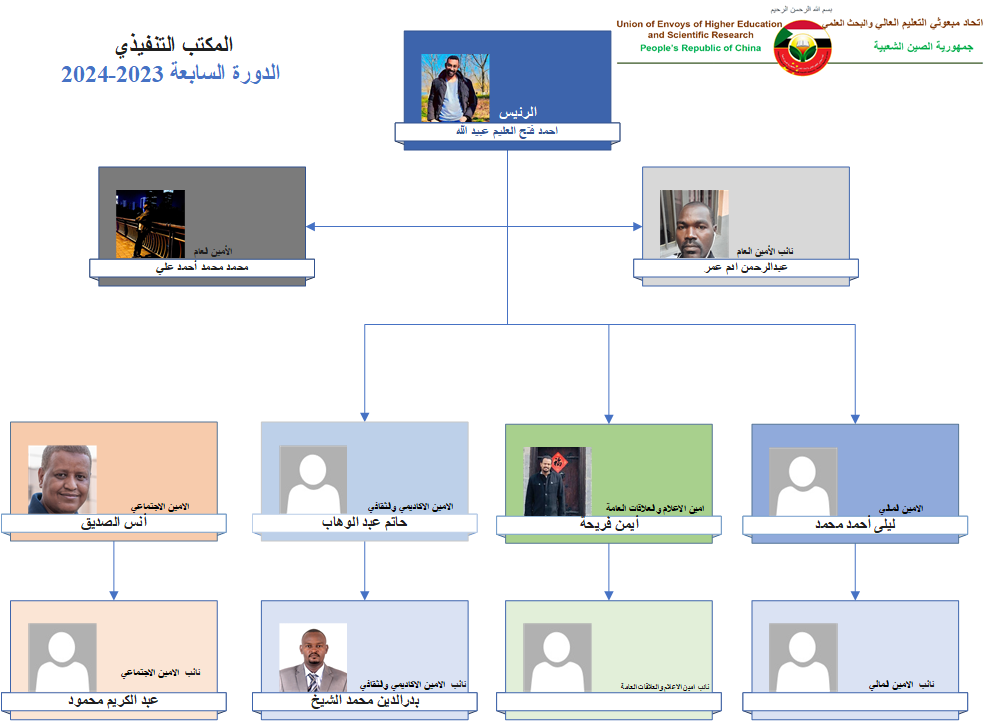 اتحاد الطلاب السودانيين المبتعثين من وزارة التعليم العالي والبحث العلمي – جمهورية الصين الشعبية الهيكل التنظيمي: يضم الاتحاد هيكلًا تنظيميًا يتألف من: المكتب التنفيذي: يشرف على جميع الأنشطة والفعاليات ويقوم بتنفيذ السياسات والقرارات الصادرة عن الجمعية العمومية. الجمعية العمومية: تتكون من جميع الأعضاء وتقوم باتخاذ القرارات الهامة وانتخاب المكتب التنفيذي. المكتب التنفيذي للاتحاد تشكيل المكتب التنفيذي المنتخب لاتحاد مبعوثي التعليم العالي والبحث العلمي - جمهورية الصين الشعبية الدورة السابعة 2023-2024 أحمد فتح العليم عبيد الله الرئيس محمد محمد احمد علي الامين العام عبد الرحمن ادم عمر نائب الامين العام ليلى احمد محمد الامين المالي ايمن فريحة الأمين الإعلامي والعلاقات الاجتماعية حاتم عبد الوهاب يوسف الأمين الأكاديمي والثقافي أنس الصديق الأمين الاجتماعي بدرالدين محمد الشيخ نائب الأمين الأكاديمي والثقافي عبد الكريم محمود نائب الأمين الاجتماعي ايهاب حاتم جاد الرب نائب الامين المالي تحميل النظام الاساسي للاتحاد تحميل رؤية المكتب التنفيذي